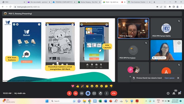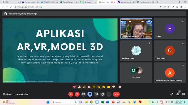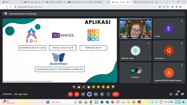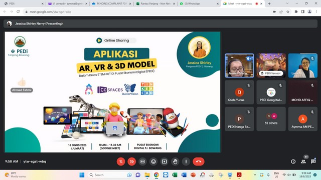 19 Ogos 2023 | Aktiviti TerkiniPada 18 Ogos 2023, Jumaat, staff Pusat Ekonomi Digital (PEDi) Rantau Panjang telah mengikuti Online Sharing: Aplikasi AR, VR dan 3D Model yang telah dianjurkan oleh Pengurus PEDi Tanjung Bowang iaitu Jessica Shirley. Perkongsian tersebut telah bermula dari pukul 10:00 pagi sehingga pukul 11:30 pagi dan telah dijalankan menggunakaan platform Google Meet. Seramai 100 orang staff PEDi dari seluruh PEDi di Malaysia telah menyertai perkongsian tersebut.