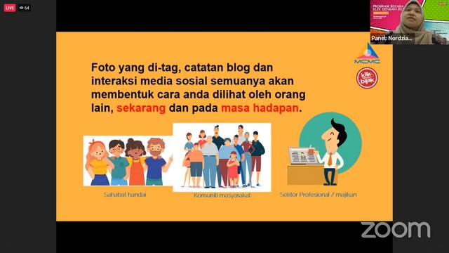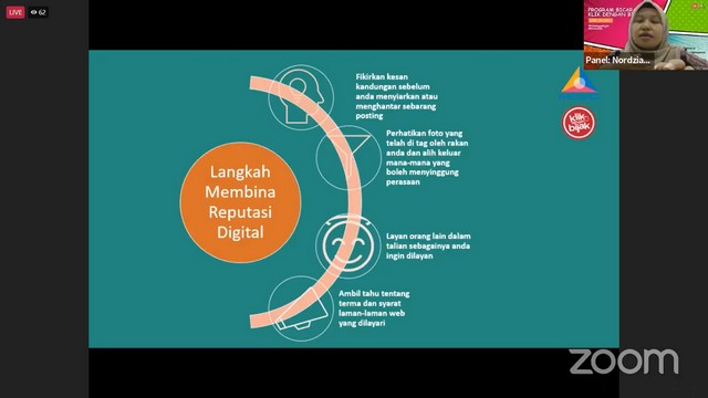 Beliau telah dijemput untuk berkongsi dengan sukarelawan tentang cara-cara yang betul untuk menghasilkan jejak digital yang positif atas talian bagi menjaga maruah diri kita. Pada akhir program bicara tersebut, kuiz Klik Dengan Bijak telah dilakukan menggunakan MyCyberGenius bagi menguji pemahaman para sukarelawan mengenai topik yang telah diterangkan. Diharapkan dengan program Bicara Klik Dengan Bijak yang bertajuk Membina Reputasi Digital ini dapat memberi manfaat kepada penduduk setempat supaya mereka boleh menjadi pengguna internet yang lebih bertanggungjawab.