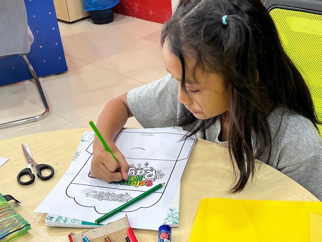 Bahan-bahan yang diperlukan untuk aktiviti ialah gunting, gam, kertas sampul yang telah dicetak, dan pensel warna. Mula-mula, para peserta diminta untuk mewarna lakaran sampul yang telah dicetak dengan kemas dan cantik. Selepas selesai mewarna, sampul Hari Raya tersebut digunting dan dilipat untuk membentuk seperti sampul. Tujuan aktiviti ini adalah untuk melatih kemahiran motor halus dan motor kasar para peserta.
