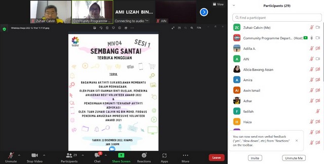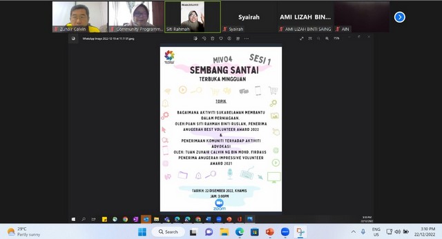 23 Disember 2022 | Aktiviti TerkiniPada 22 Disember 2022, Khamis, Pusat Ekonomi Digital Malaysia (PEDi) Rantau Panjang telah menghadiri Sembang Santai MIVO4 secara atas talian. Bengkel ini bermula pada pukul 03:00 petang sehingga 4:00 petang. Program ini diadakan di secara atas talian melalui Aplikasi ZOOM MEET.