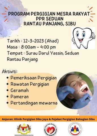 13 Mac 2023 | Aktiviti TerkiniPada 12 Mac 2023, Ahad, pengurus dan penolong pengurus PEDi Rantau Panjang telah menghadiri Program Pergigian Mesra Rakyat PPR Seduan Rantau Panjang yang telah dianjurkan oleh Klinik Pergigian Sibu Jaya dan Pejabat Pergigian Bahagian Sibu. Program ini diadakan di Surau Darul Yassin, Seduan Rantau Panjang yang bermula dari pukul 8:00 pagi sehingga 4:30 petang.