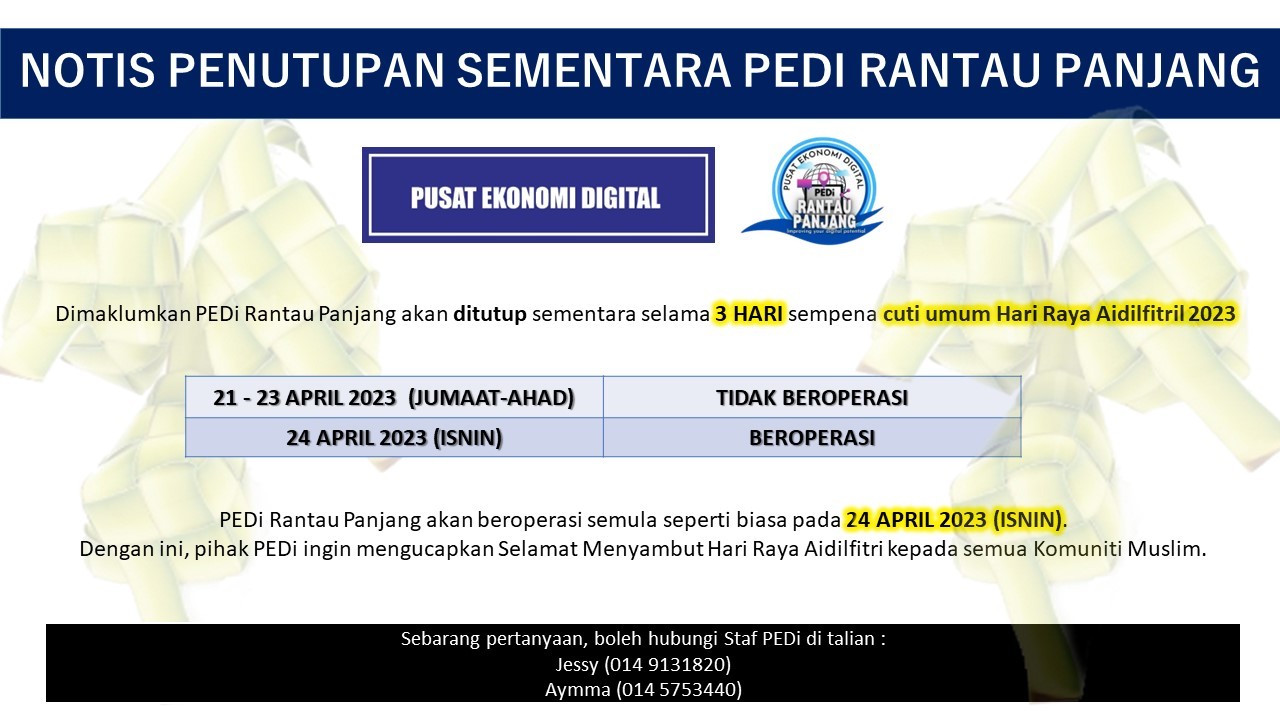 Makluman Kepada Pengguna PEDi Rantau Panjang, PEDi Tidak Beroperasi Pada Tarikh 21 Hingga 23 April Sempena Dengan Cuti Umum Iaitu Hari Raya Aidilfitri 2023. Pihak Kami Akan Beroperasi Semula Pada 24 April 2023 (Rabu).