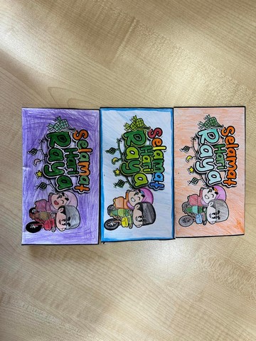 Bahan-bahan yang diperlukan untuk aktiviti ialah gunting, gam, kertas sampul yang telah dicetak, dan pensel warna. Mula-mula, para peserta diminta untuk mewarna lakaran sampul yang telah dicetak dengan kemas dan cantik. Selepas selesai mewarna, sampul Hari Raya tersebut digunting dan dilipat untuk membentuk seperti sampul. Tujuan aktiviti ini adalah untuk melatih kemahiran motor halus dan motor kasar para peserta.