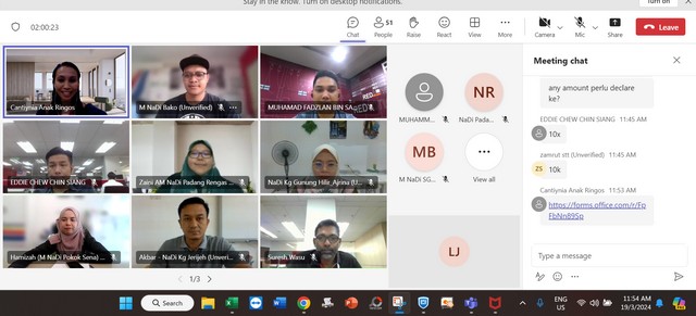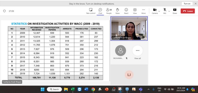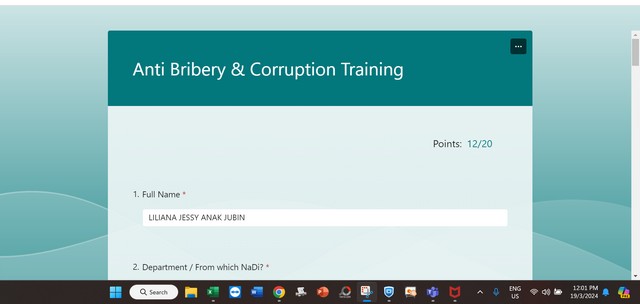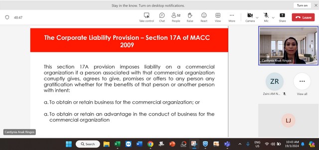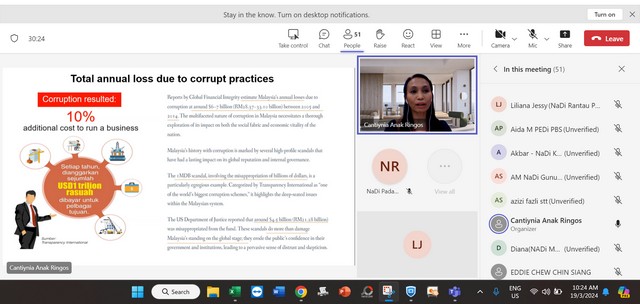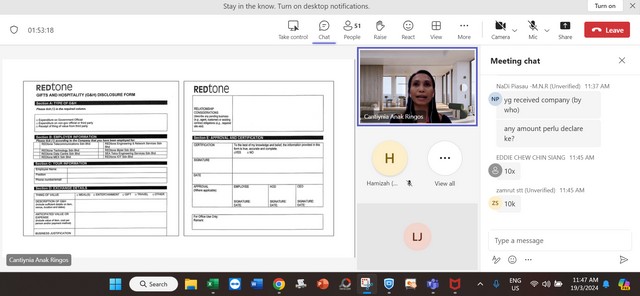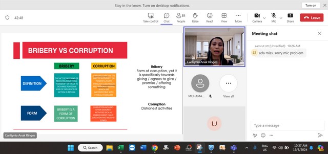 20 Mac 2024 | Aktiviti TerkiniPada 19 Mac 2024, Selasa, Pengurus Pusat Sebaran Maklumat Nasional (NaDi) Rantau Panjang telah menyertai staf training iaitu Compliance: Anti Bribery & Corruption secara online (Microsoft Team) yang bermula dari pukul 10:00 pagi sehingga 12:00 petang. Staff training tersebut telah dikendalikan oleh Cik Cantiynia Anak Ringos yang merupakan staf dari REDtone.