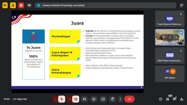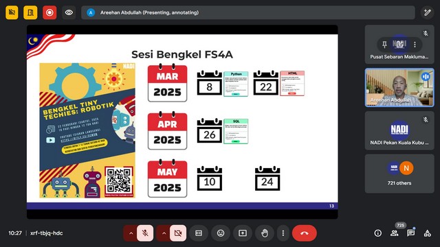 7 Mac 2025 | Aktiviti TerkiniPada 6 Mac 2025, Khamis, Pusat Sebaran Maklumat Nasional (NADI) Rantau Panjang telah menyertai Bengkel Tiny Techies Bersama NADI yang bermula daripada pukul 10:00 pagi sehingga 12:00 tengahari. Google Meet telah digunakan sebagai platform penyampaian bengkel tersebut.
